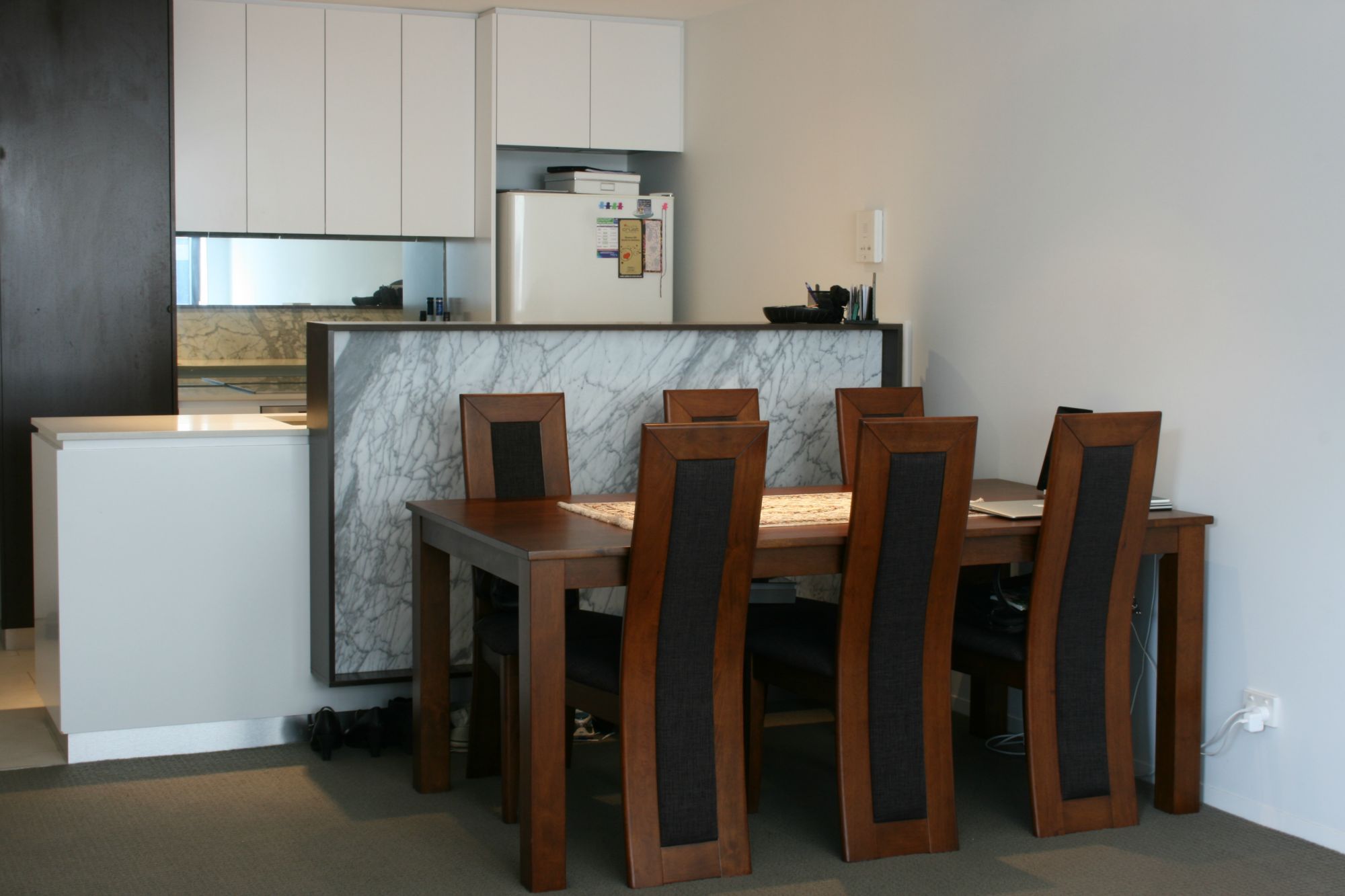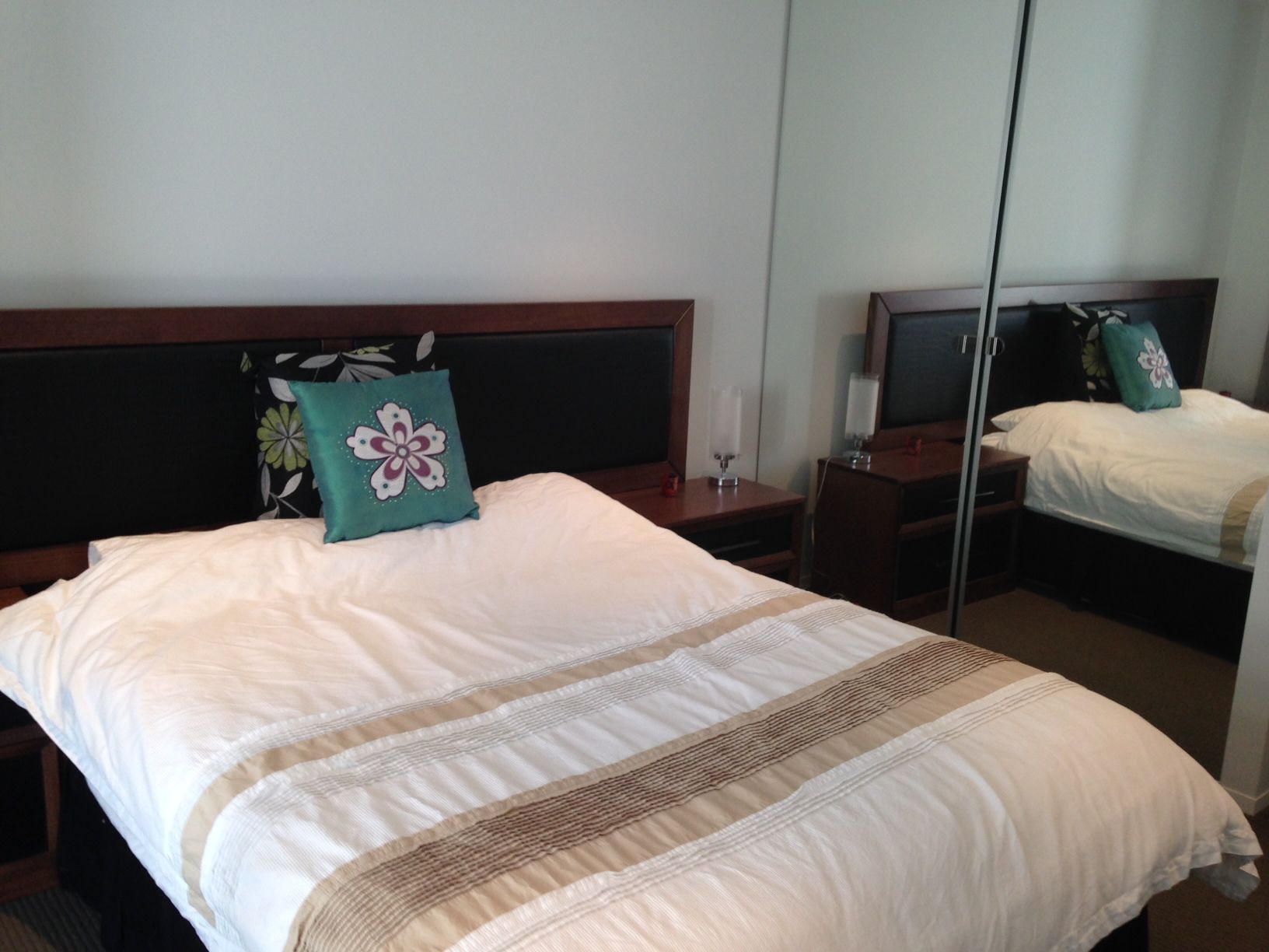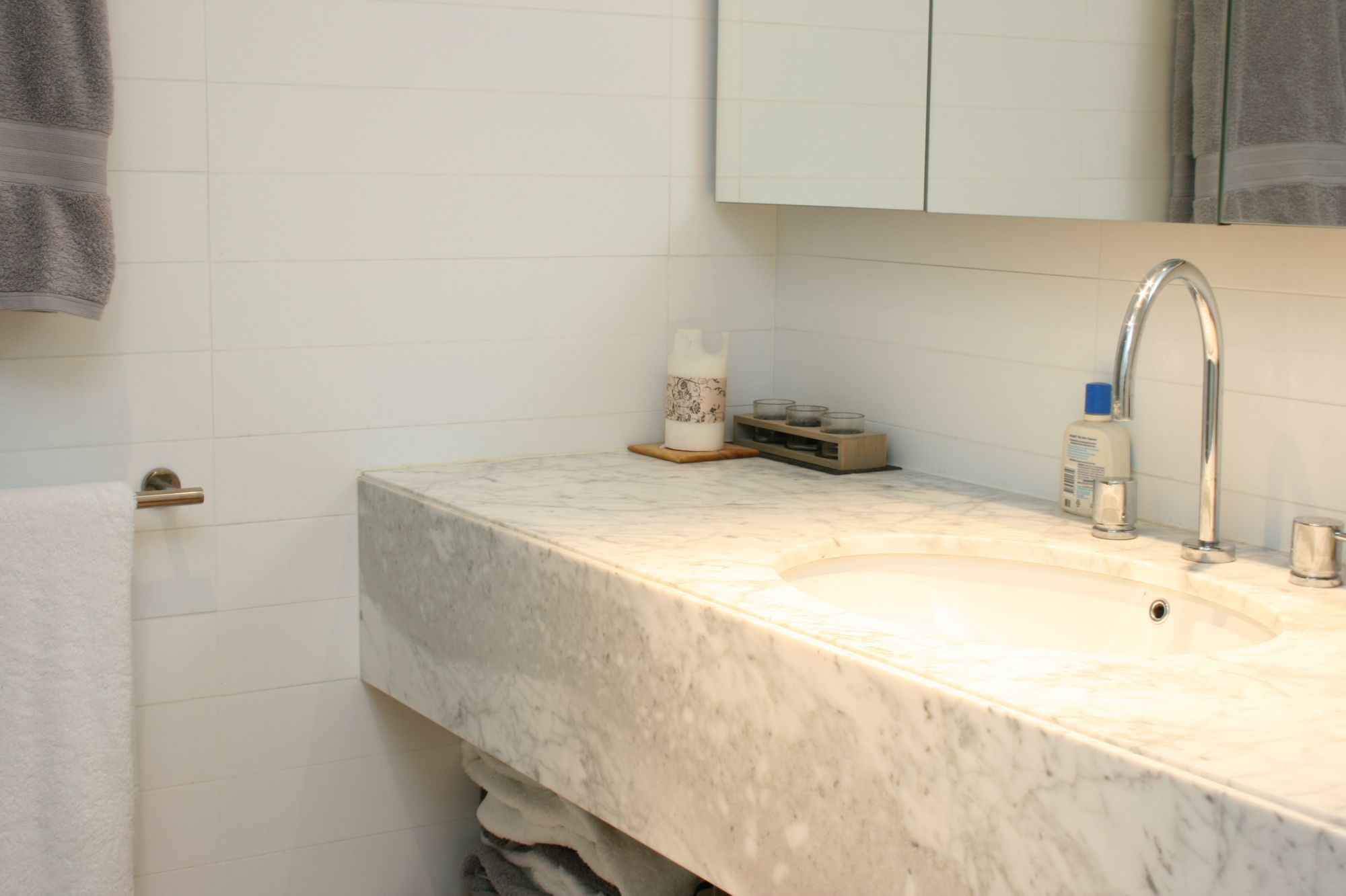 The bathroom features quality marble benchtops and plenty of storage space with mirrored wall cabinet.
