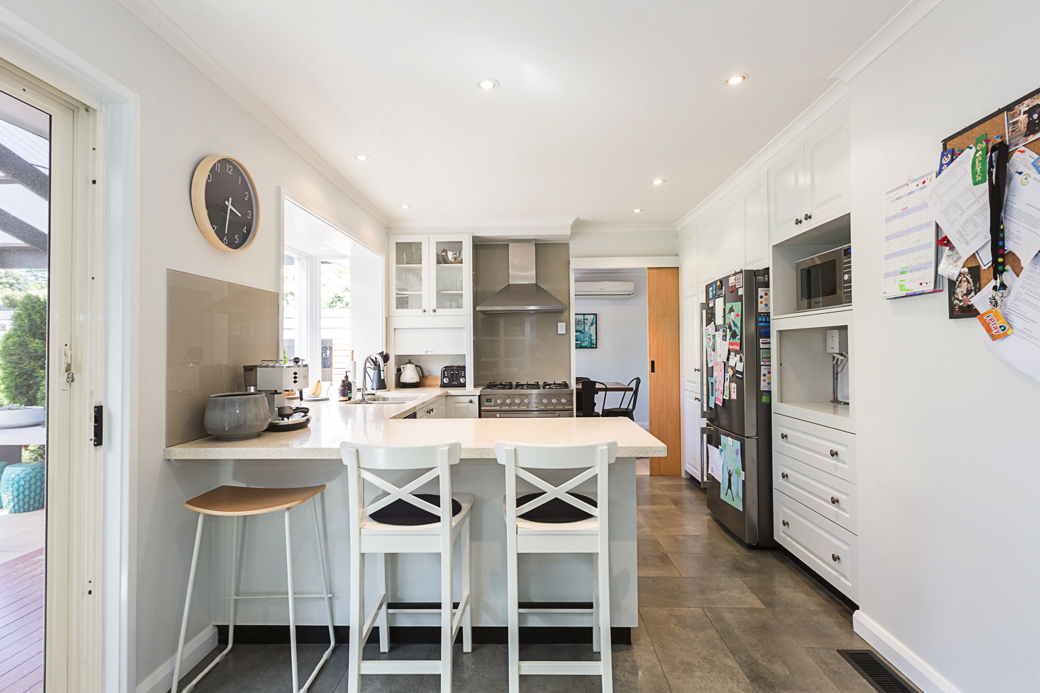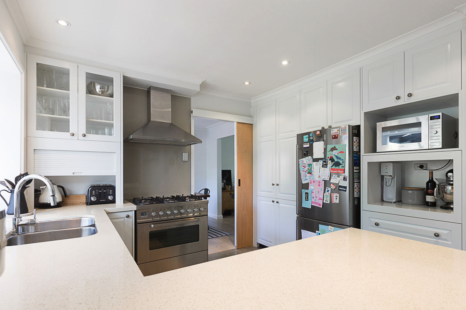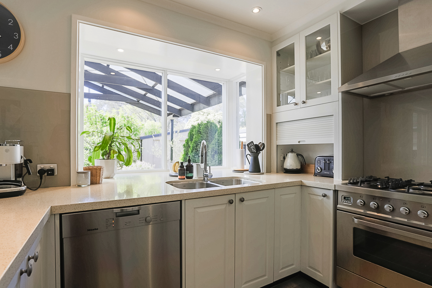 • Modern kitchen with Caesar stone benchtops, Miele dishwasher, large gas stove and bay window