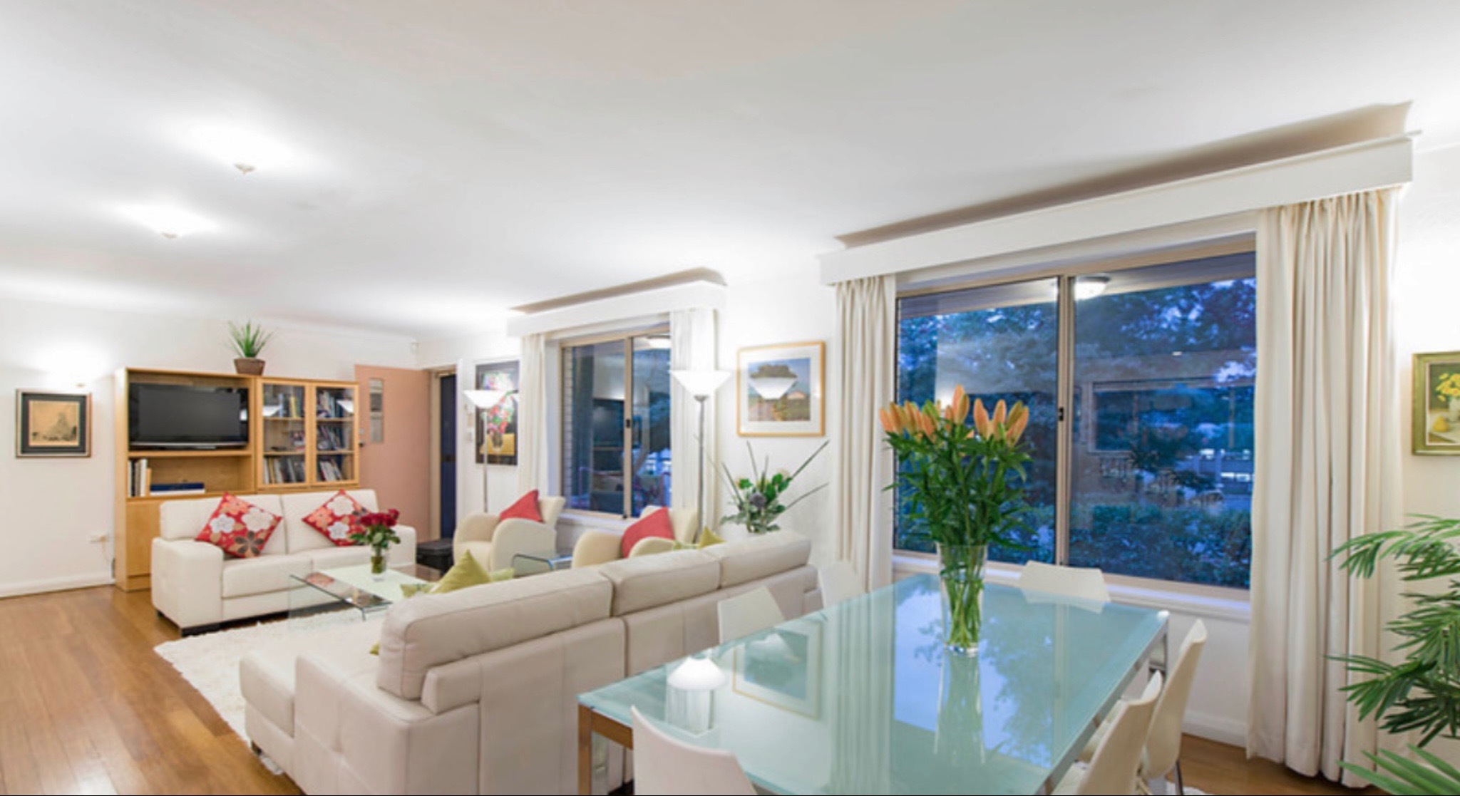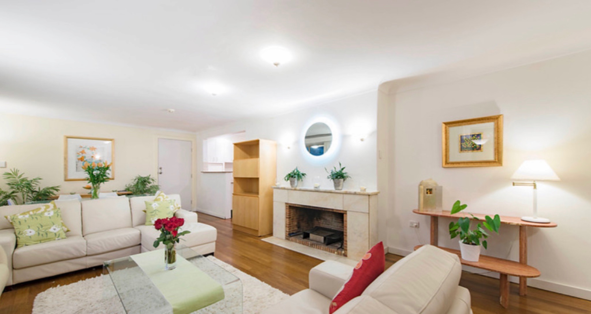 • North facing open plan living room with Blackbutt hardwood floors and wood fire with marble hearth