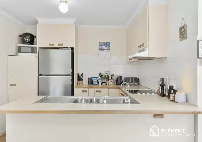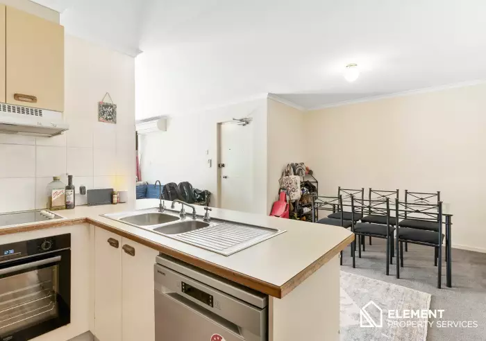 The light-filled open-plan living and dining area flows seamlessly to a north-facing balcony, perfect for entertaining or relaxing. The spacious kitchen features plenty of storage, electric cooking, dual sinks, and a dishwasher.