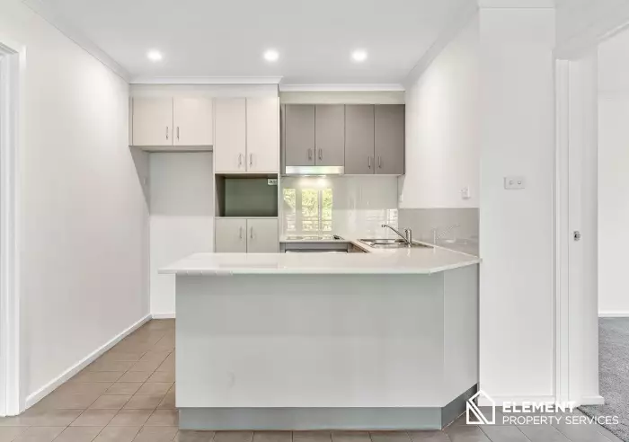 The modern kitchen is equipped with stone benchtops, stainless steel appliances, glass splashback, and a breakfast bar. Both bedrooms are generously sized and privately positioned— the main features a walk-in robe and ensuite, and the second includes a built-in wardrobe.