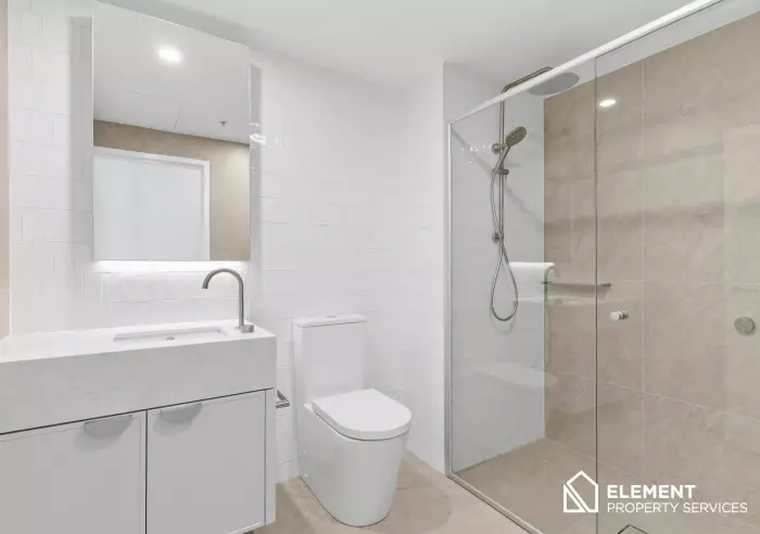 Both bedrooms are generous in size and thoughtfully designed as peaceful retreats, complete with built-in wardrobes and beautiful curved windows. The oversized central bathroom is finished to a luxurious standard, offering full-height stone-look tiling, a custom vanity with undermount basin, mirror-fronted shaving cabinet, and brushed nickel tapware for a refined, spa-like feel. Ducted reverse-cycle air conditioning ensures year-round comfort throughout the apartment.