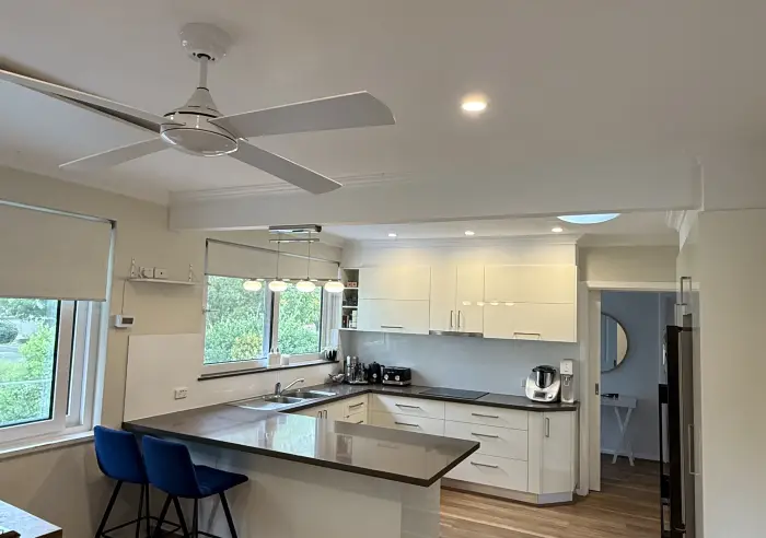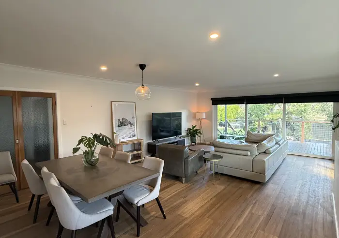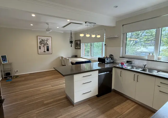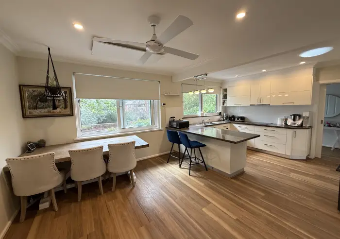 The  renovated kitchen is filled with natural light and overlooks the meals area, featuring sleek Caesarstone benchtops, an induction cooktop, and a dishwasher for everyday convenience. Flowing on from here, the spacious combined lounge and dining area opens out to the rear patio and backyard—ideal for both relaxing and entertaining.